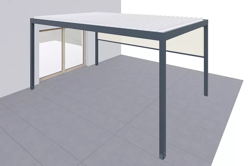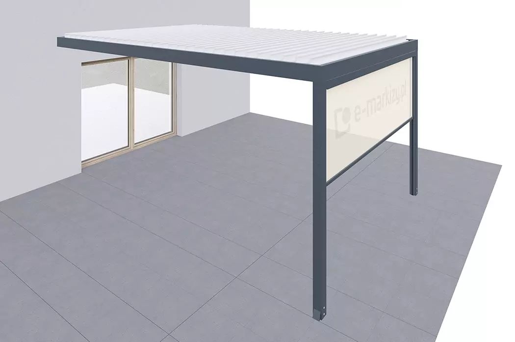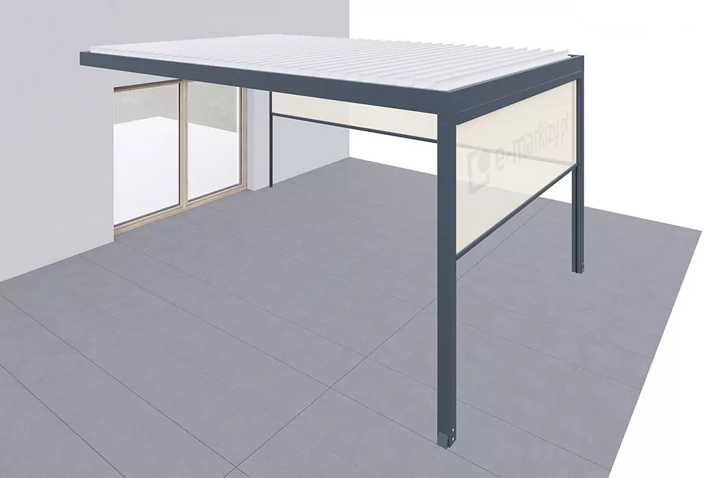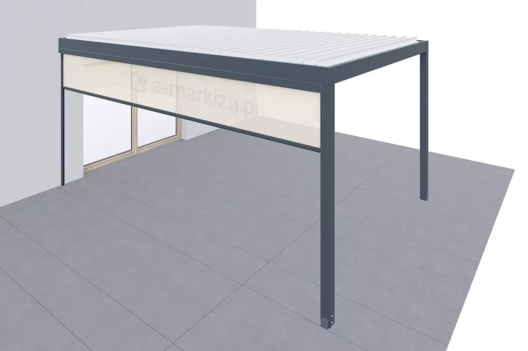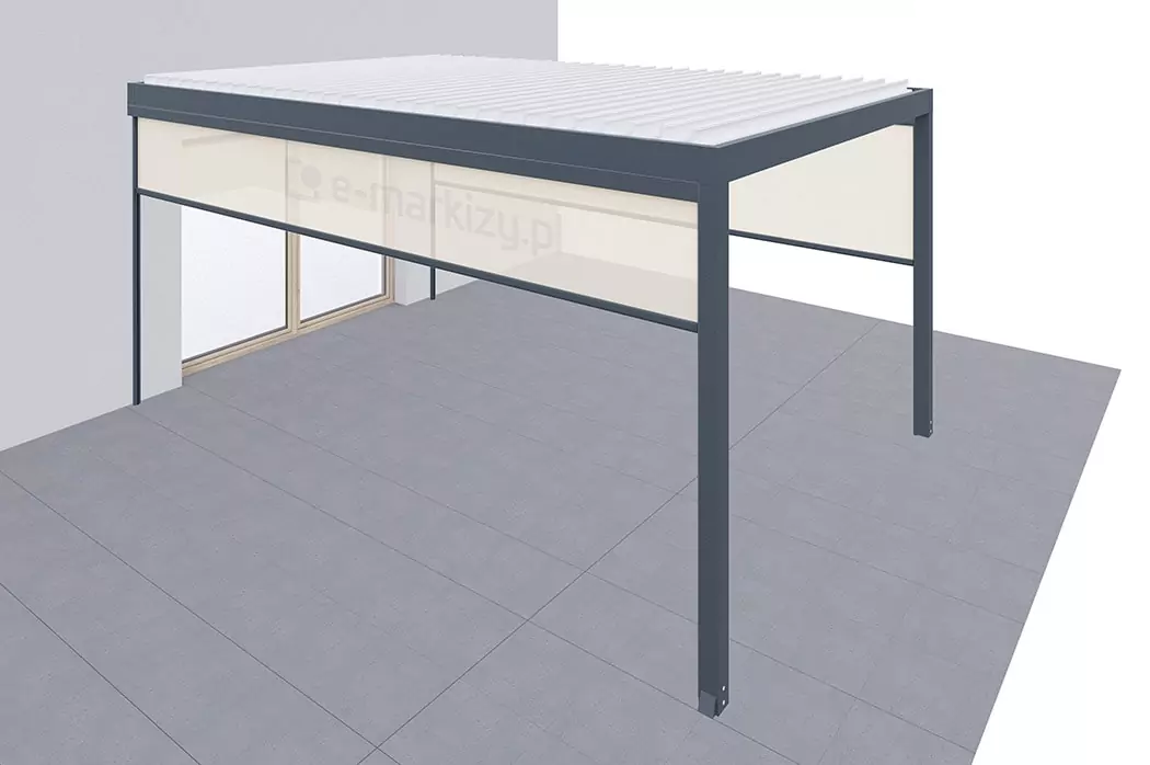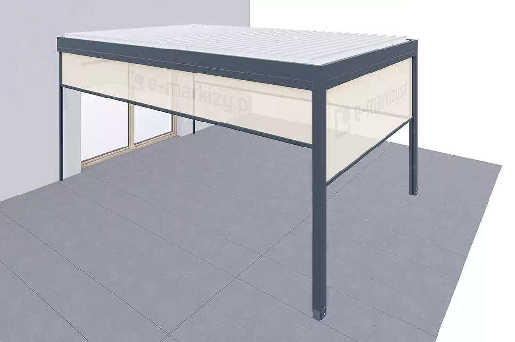 The Sun Screen screen type roller blind provides protection against wind from the front of the terrace. The cover is mounted on aluminum guides from the inside of the pergola structure. The side cover is controlled using a dedicated wireless remote control.